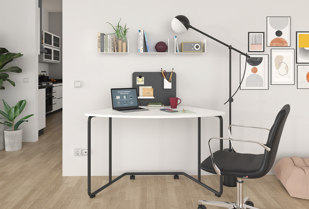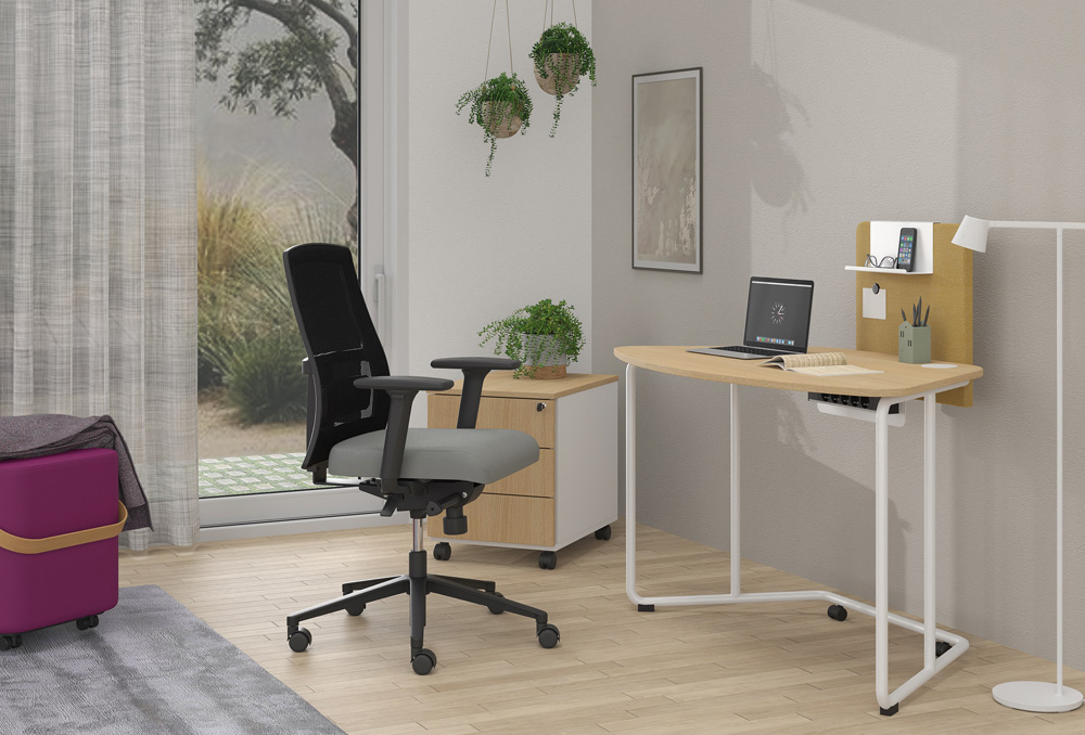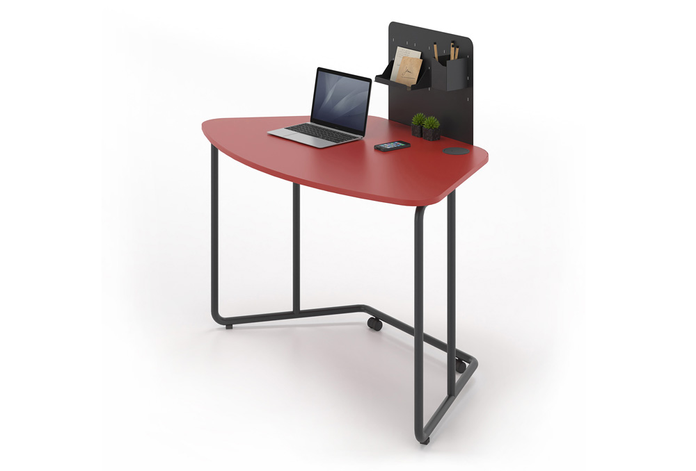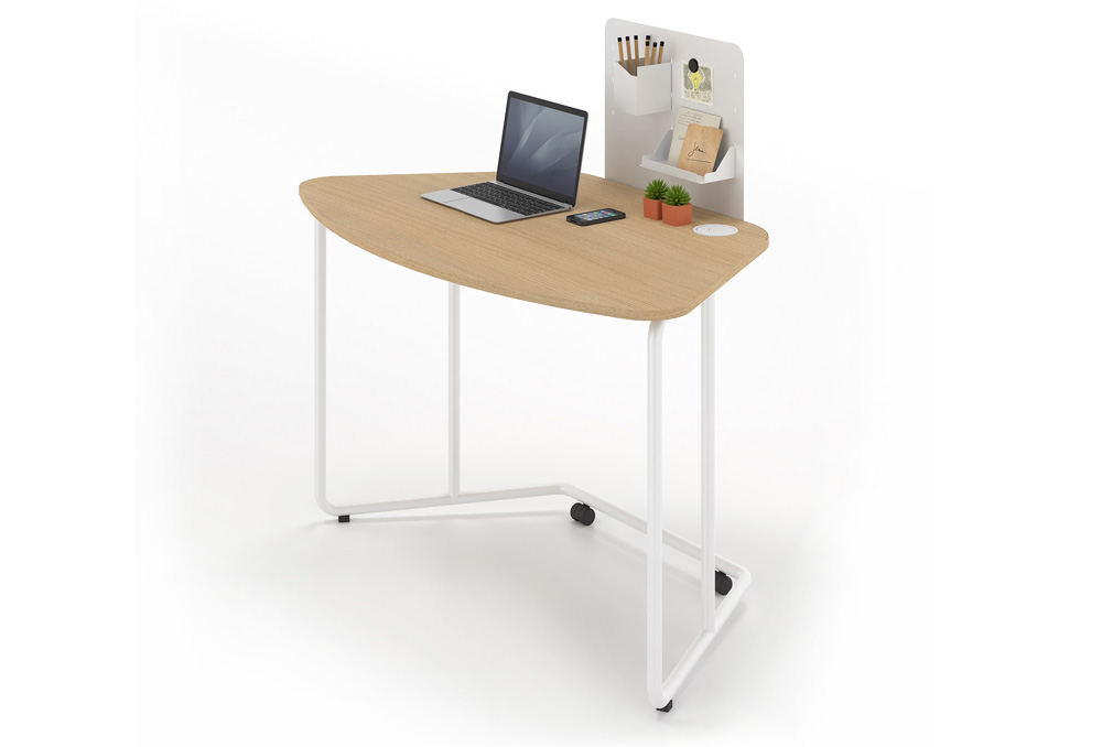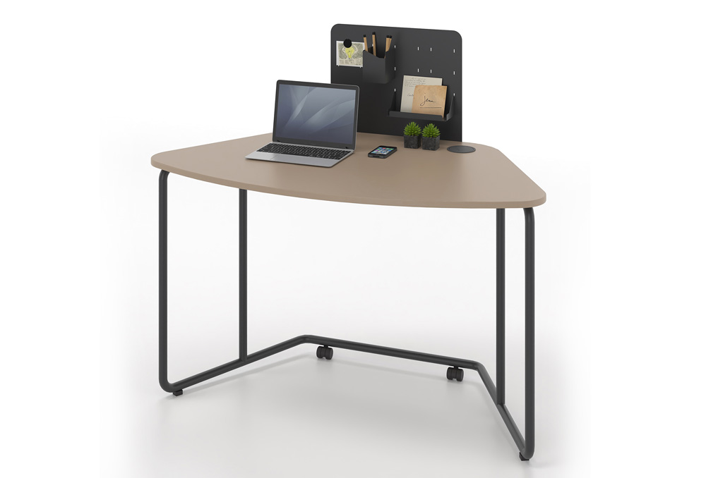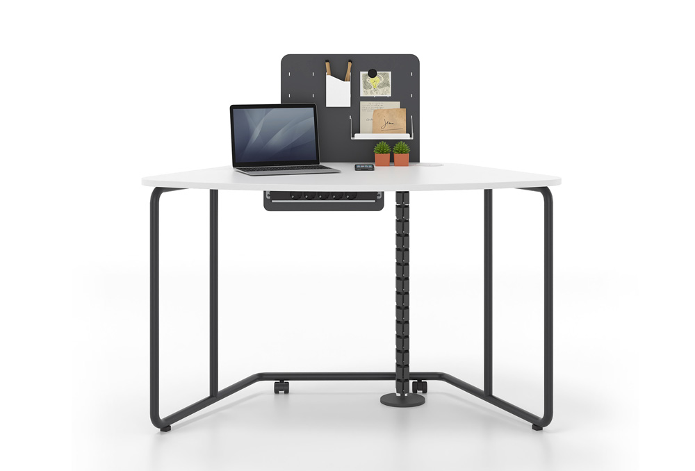 Το γραφείο φέρει ρόδες με φρένο για εύκολη μετακίνηση. Στην επιφάνεια του γραφείου μπορεί να τοποθετηθεί μεταλλικό ή ηχοαπορροφητικό διαχωριστικό, επί του οποίου τοποθετούνται ραφάκια και λοιπά αξεσουάρ.